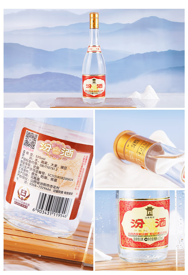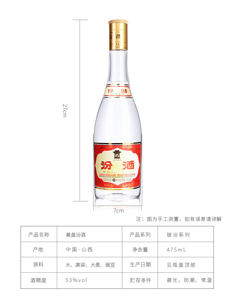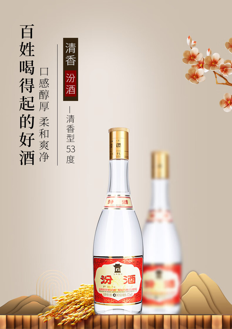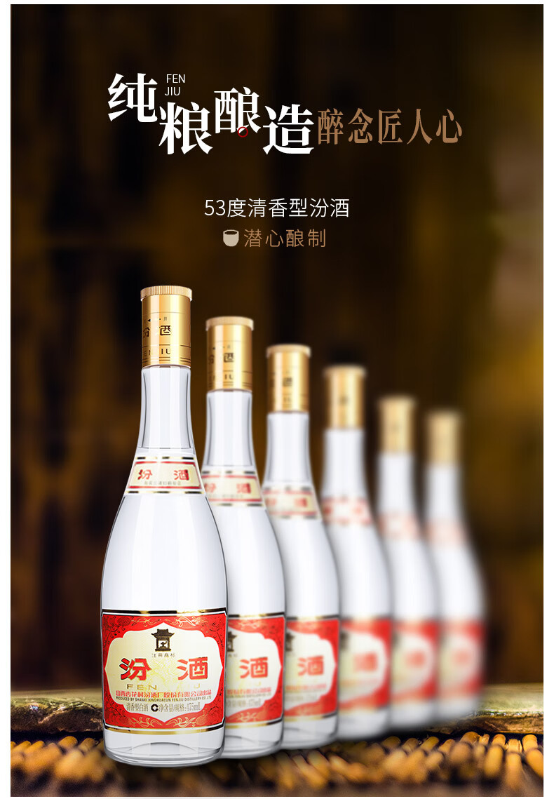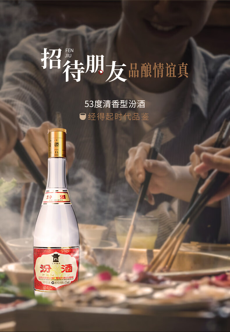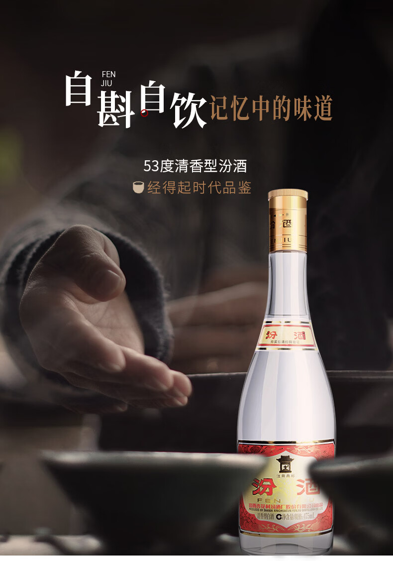 汾酒 山西汾酒杏花村酒 53度黄盖玻汾475ml单瓶清香型白酒 53度 475mL 1瓶